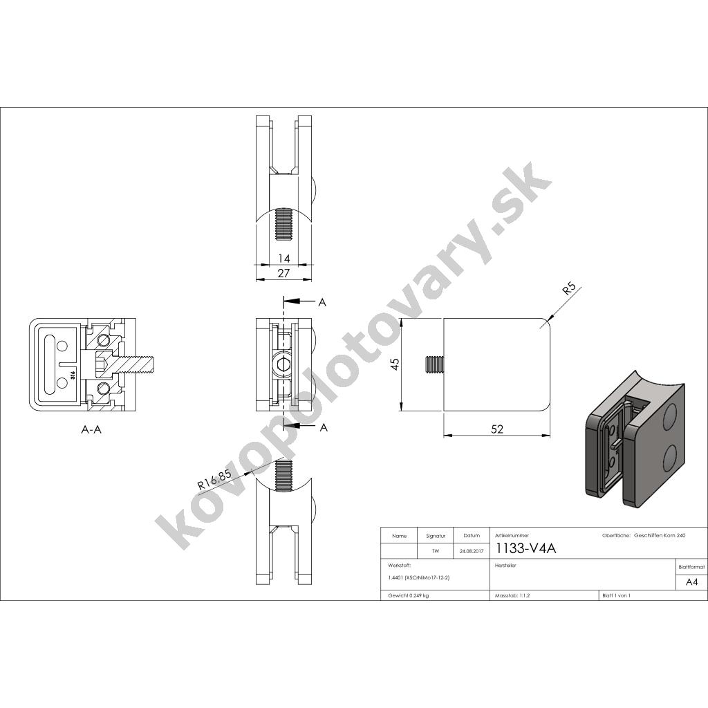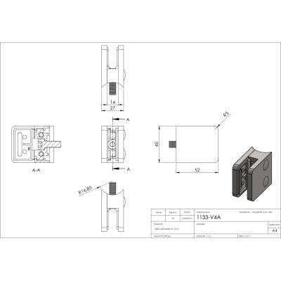 Hloubka: 26; Materiál: ocel nerezová; Model: 31; Povrchová úprava: mat / brus K240; Pro tloušťku výplně: 1,5; 10; 10,76; 2; 3; 4; 6; 6,76; 8; 8,76; 9,52; Šířka: 45; Třída oceli: AISI 316 (A4); Tvar držáku: hranatý; Typ závitu: M8; Uchycení: na trubku pr. 33,7 mm; Výška: 45; Zajišťovací čep: volitelné; Zajišťovací podpěra: volitelné;
