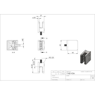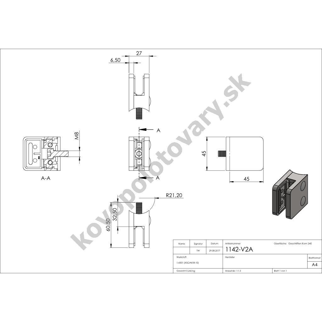 Hloubka: 26; Materiál: ocel nerezová; Model: 31; Povrchová úprava: mat / brus K240; Pro tloušťku výplně: 1,5; 10; 10,76; 2; 3; 4; 6; 6,76; 8; 8,76; 9,52; Šířka: 45; Třída oceli: AISI 304 (A2); Tvar držáku: hranatý; Typ závitu: M8; Uchycení: na trubku pr. 42,4 mm; Výška: 45; Zajišťovací čep: volitelné; Zajišťovací podpěra: volitelné;