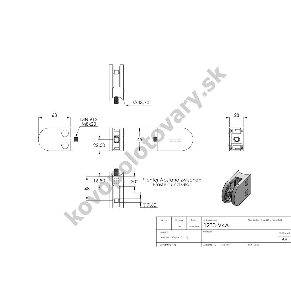 Hloubka: 28; Materiál: ocel nerezová; Model: 32; Povrchová úprava: mat / brus K240; Pro tloušťku výplně: 1,5; 10; 10,76; 2; 3; 4; 6; 6,76; 8; 8,76; 9,52; Šířka: 63; Třída oceli: AISI 316 (A4); Tvar držáku: oblý; Typ závitu: M8; Uchycení: na trubku pr. 33,7 mm; Výška: 45; Zajišťovací čep: volitelné; Zajišťovací podpěra: ne;