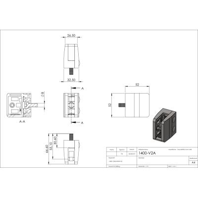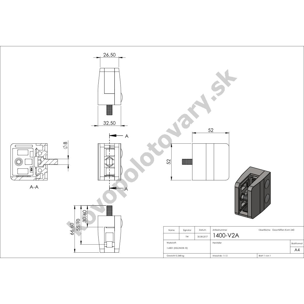 Hloubka: 32,5; Materiál: ocel nerezová; Model: 34; Povrchová úprava: mat / brus K240; Pro tloušťku výplně: 1,5; 10; 10,76; 11,52; 12; 12,76; 2; 3; 4; 8; 8,76; 9,52; Šířka: 52; Třída oceli: AISI 304 (A2); Tvar držáku: hranatý; Typ závitu: M8; Uchycení: na rovinu; Výška: 52; Zajišťovací čep: volitelné; Zajišťovací podpěra: volitelné;
