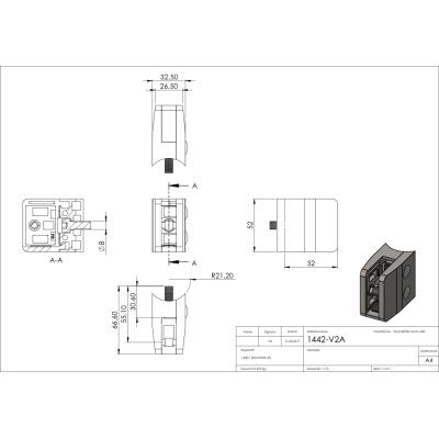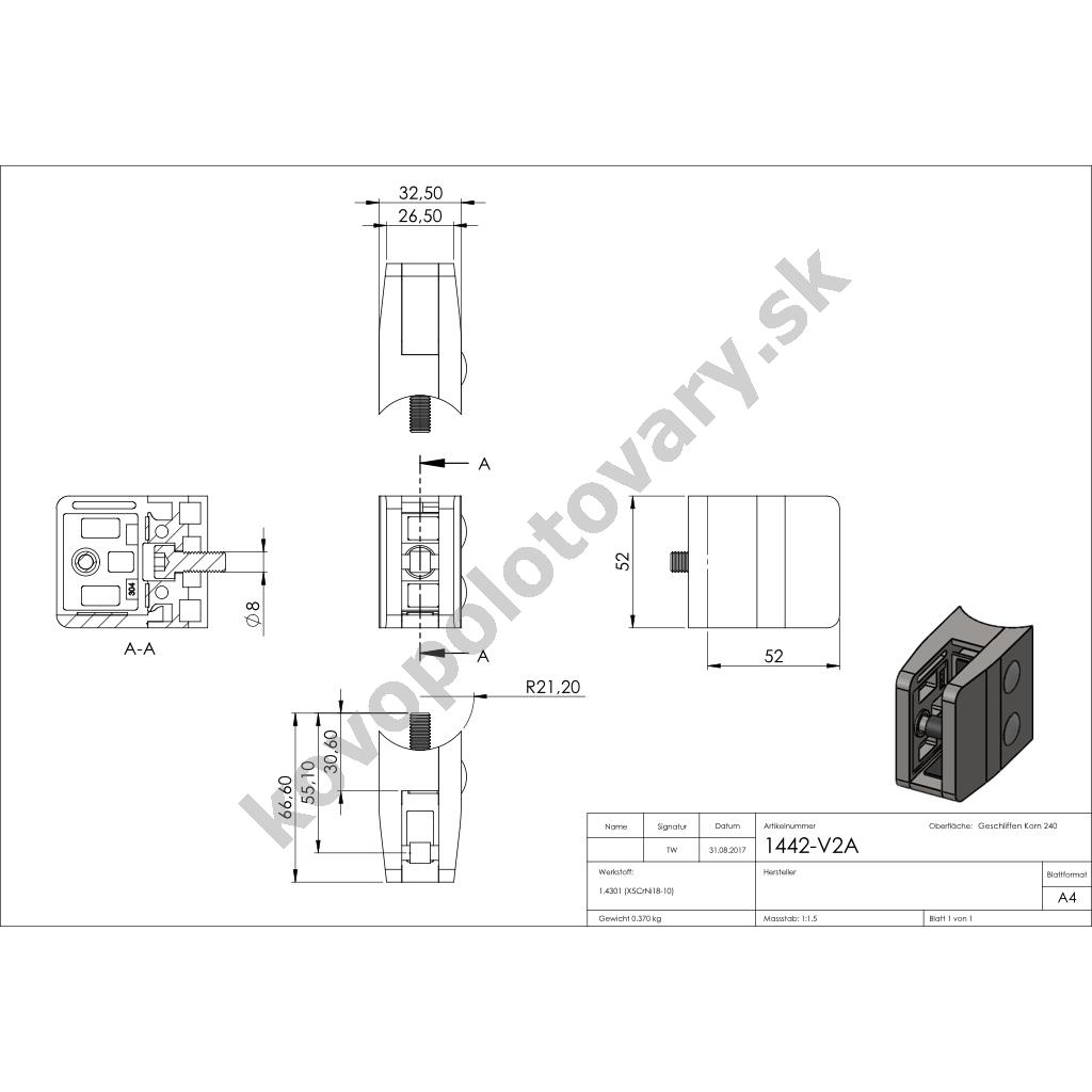 Hloubka: 32,5; Materiál: ocel nerezová; Model: 34; Povrchová úprava: mat / brus K240; Pro tloušťku výplně: 1,5; 10; 10,76; 11,52; 12; 12,76; 2; 3; 4; 8; 8,76; 9,52; Šířka: 52; Třída oceli: AISI 304 (A2); Tvar držáku: hranatý; Typ závitu: M8; Uchycení: na trubku pr. 42,4 mm; Výška: 52; Zajišťovací čep: volitelné; Zajišťovací podpěra: volitelné;