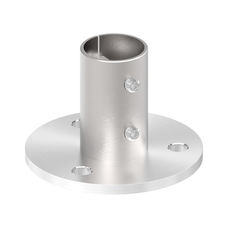 Nerezová kotviaca príruba s upínacími skrutkami použiteľná ako základňa stĺpiku alebo ukotvenie konca madla zábradlia k stene. Určené pre vnútorné i vonkajšie použitie v systémoch stavebnicového nerezového zábradlia a schodísk.