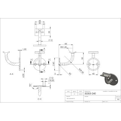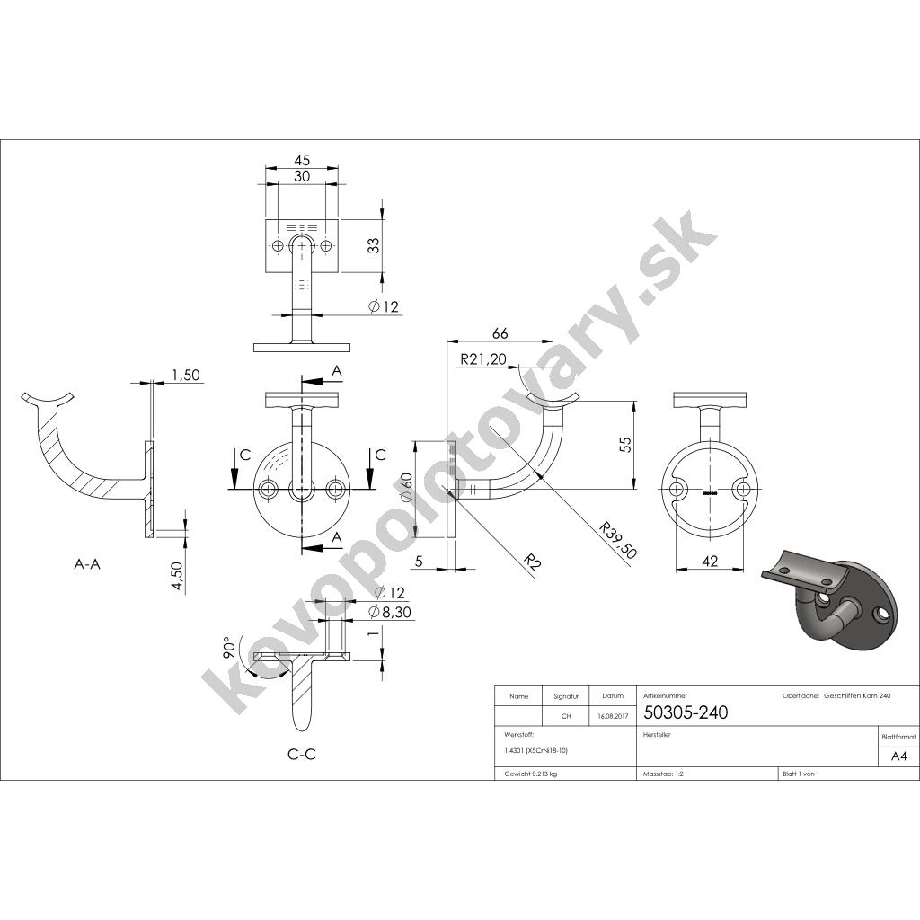 50305-240 - nerezový držák madla pr.42,4 mm, na zeď, z jednoho kusu, pro nerezové zábradlí