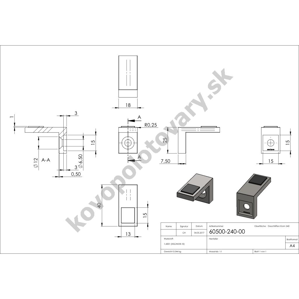 Hloubka: 37,5; Materiál: ocel nerezová; Model: 35; Povrchová úprava: mat / brus K240; Pro tloušťku výplně: 10; 10,76; 11,52; 12; 12,76; 13,52; 16,76; 17,52; 8; 8,76; 9,52; Šířka: 55; Třída oceli: AISI 304 (A2); Tvar držáku: hranatý; Typ závitu: M8; Uchycení: na rovinu; Výška: 65; Zajišťovací čep: volitelné; Zajišťovací podpěra: volitelné;