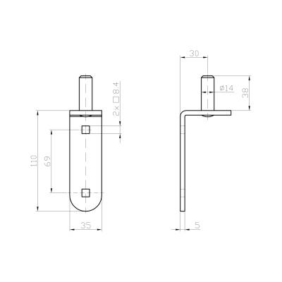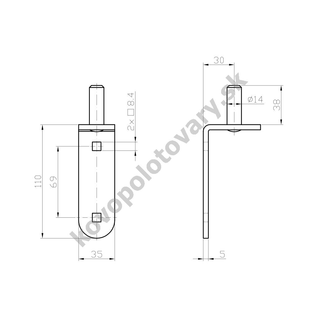 Délka: 148; Materiál: ocel; Montáž: přišroubování; Povrchová úprava: barveno; Průměr čepu: 14; Šířka: 35; Tloušťka: 5; Výrobce: PSG;