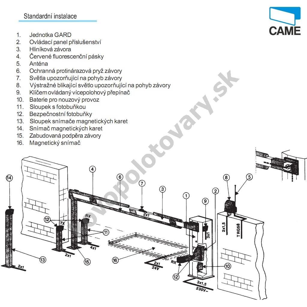 Jedná sa o najpoužívanejší typ cestné závory určené pre intenzívnu prevádzku. Tento pohonový set závory je vhodný pre šírku prejazdu do 4 m. Súčasťou pohonu závory je zabudovaná riadiaca jednotka s rádiovým prijímačom. Všetky závory serie CAME GARD sú prispôsobené k zapojeniu širokej škály bezpečnostných a ovládacích prvkov (semafory, turnikety atď.)