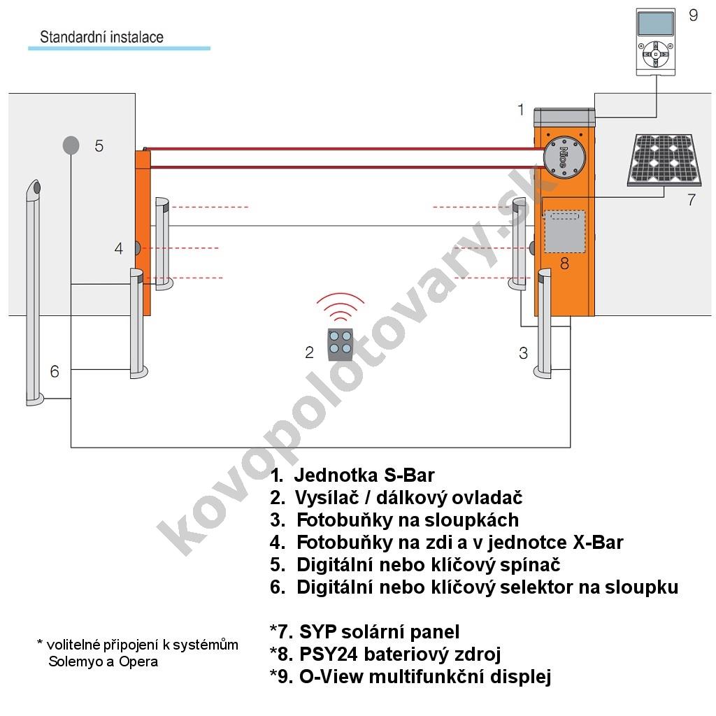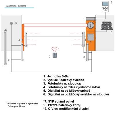 Súčasťou pohonu závory je zabudovaná riadiaca jednotka s rádiovým prijímačom. Automatická závora série NICE S-BAR je prispôsobená k zapojeniu širokej škály bezpečnostných a ovládacích prvkov bližšie viz. technické nákresy. K základnej zostave je možné dokúpiť celý škálou doplnkov a rozširujúcich prvkov ako záložné batérie, náhradnú riadiacu jednotku, podperu rahná, cestná a blikacie LED svetlá pre osadenie na rahno, maják, fotobunky, všetko možno nájsť v našej ponuke príslušenstva.