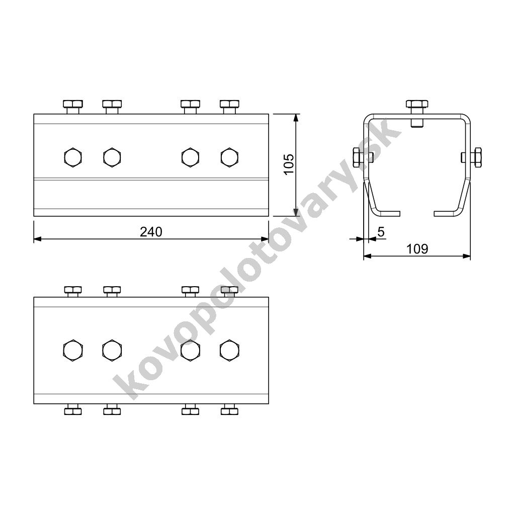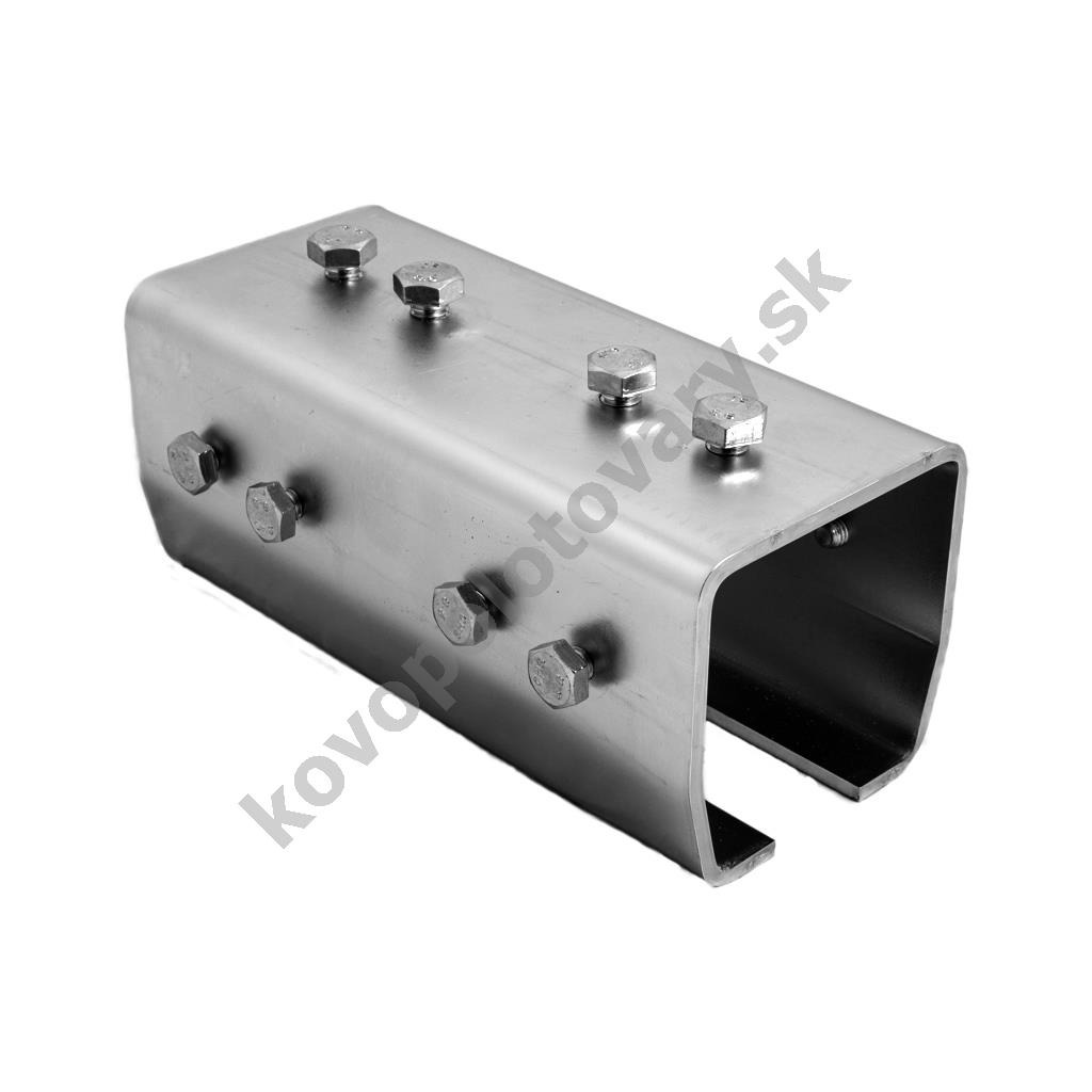 Fixačná spojka pre napojenie vodiaceho C profilu závesné brány bez nutnosti zvárania a porušenia povrchovej úpravy.