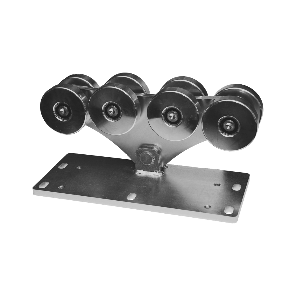 Nosný osemkolesový kyvný vozík pre posuvné samonosné brány do svahu. Kotviaca platňa je u tohto vozíka odsadená k jednej strane tak, aby bolo možné vozík kotviť na hranu betónového základu.