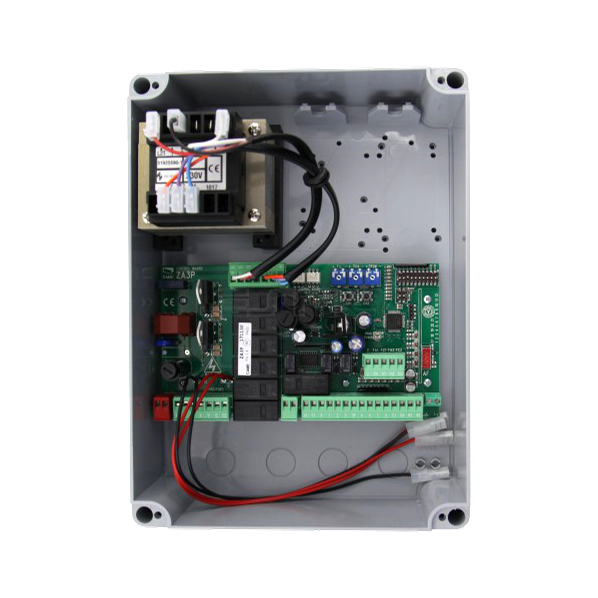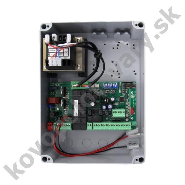 s napájaním 230 V pre krídlové brány. Riadiaca jednotka s transformátorom sú uložené v plastovej vodeodolné krabici s krytím IP54. Jedná sa o náhradu riadiacej jednotky ZA3N.