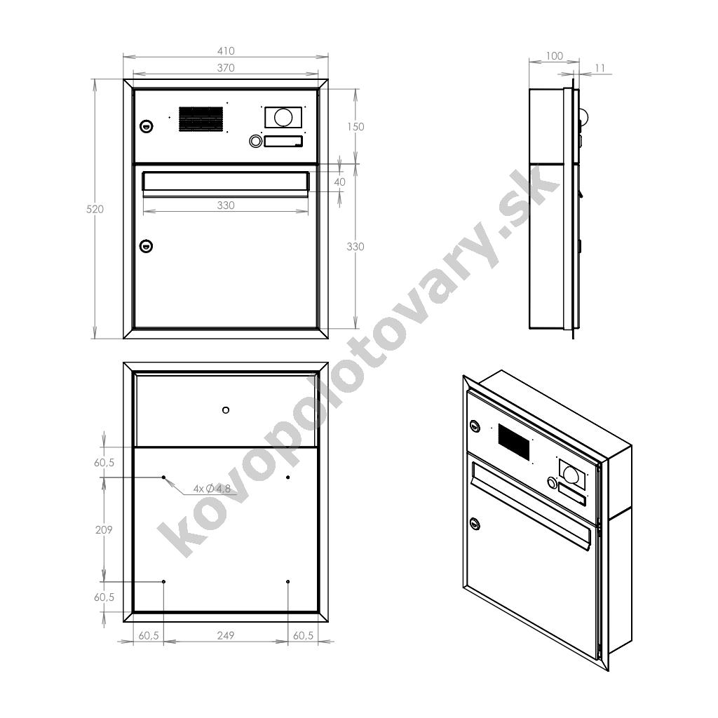 Barva schránky: Nerez; Hloubka schránky: 100; Jmenovka: Ano; Kamera: Ne; Komunikátor: Ne; Materiál: ocel; ocel nerezová; Montáž: zabudování; Povrchová úprava: barveno; mat / brus K240; pozinkováno; Rozměr čelní desky: 410 x 370; Šířka schránky: 370; Venkovní použití: Ano; Vhoz zásilek: vpředu; Výběr zásilek: vpředu; Výrobce: DOLS; Výška schránky: 330; Zvonkové tlačítko: Ne;