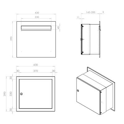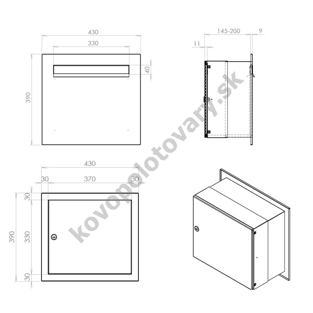 Barva schránky: Nerez; Hloubka schránky: 145 - 200; Jmenovka: Ano; Kamera: Ne; Komunikátor: Ne; Materiál: ocel; ocel nerezová; Montáž: zabudování; Povrchová úprava: barveno; mat / brus K240; pozinkováno; Rozměr čelní desky: 430 x 390; Šířka schránky: 370; Venkovní použití: Ano; Vhoz zásilek: vpředu; Výběr zásilek: vzadu; Výrobce: DOLS; Výška schránky: 330; Zvonkové tlačítko: Ne;