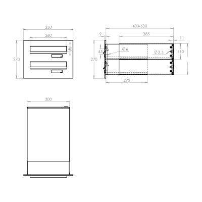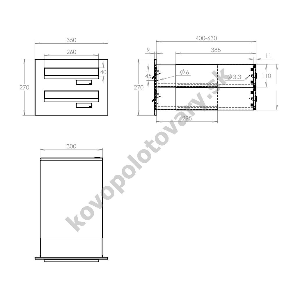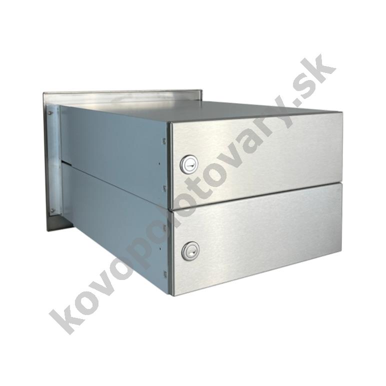 Barva schránky: Nerez; Hloubka schránky: 400 - 630; Jmenovka: Ne; Kamera: Ne; Komunikátor: Ne; Materiál: ocel; ocel nerezová; Montáž: zabudování; Povrchová úprava: barveno; mat / brus K240; pozinkováno; Rozměr čelní desky: 350 x 160; Šířka schránky: 300; Venkovní použití: Ano; Vhoz zásilek: vpředu; Výběr zásilek: vzadu; Výrobce: DOLS; Výška schránky: 110; Zvonkové tlačítko: Ne;