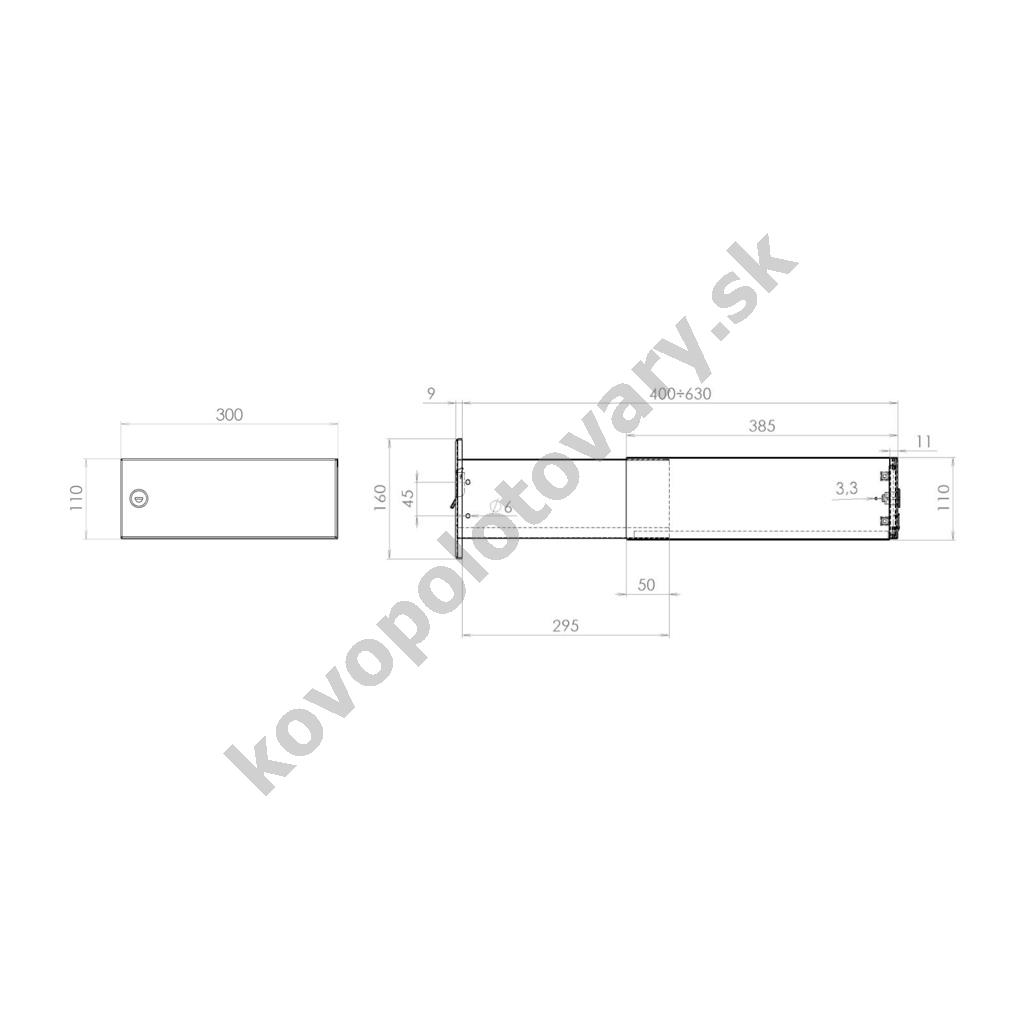 Hloubka schránky: 400 - 630; Jmenovka: Ne; Kamera: Ne; Komunikátor: Ne; Materiál: ocel; Montáž: zabudování; Povrchová úprava: barveno; pozinkováno; Rozměr čelní desky: 350 x 160; Šířka schránky: 300; Venkovní použití: Ano; Vhoz zásilek: vpředu; Výběr zásilek: vzadu; Výrobce: DOLS; Výška schránky: 110; Zvonkové tlačítko: Ne; Barva schránky: Antracit RAL 7016; Černá RAL 9005;