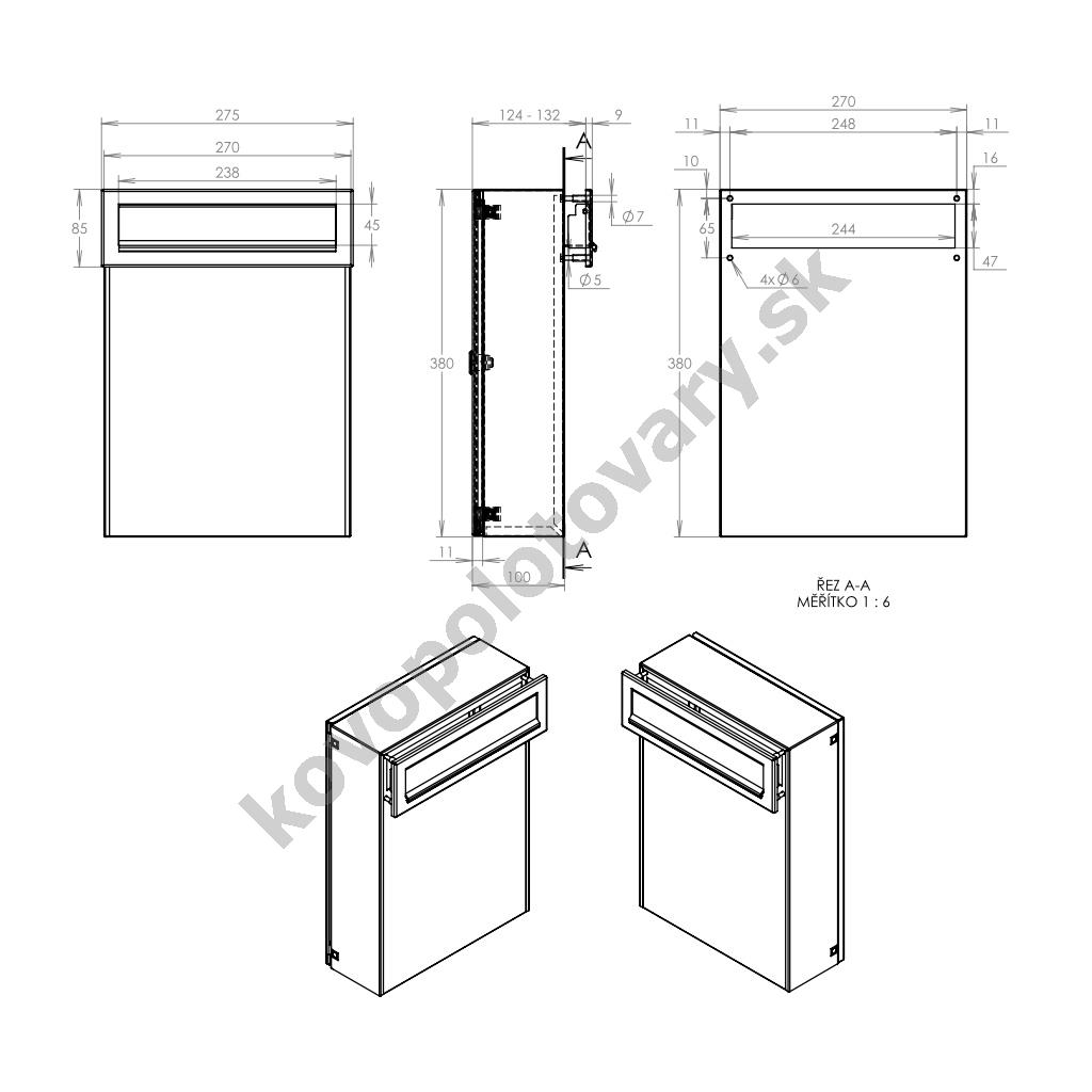 Hloubka schránky: 100; Jmenovka: Ne; Kamera: Ne; Komunikátor: Ne; Materiál: ocel; Montáž: sendvičová; Povrchová úprava: barveno; pozinkováno; Rozměr čelní desky: 275 x 85; Šířka schránky: 270; Venkovní použití: Ano; Vhoz zásilek: vpředu; Výběr zásilek: vzadu; Výrobce: DOLS; Výška schránky: 380; Zvonkové tlačítko: Ne; Barva schránky: Antracit RAL 7016; Bílá RAL 9016; Černá RAL 9005; Hnědá RAL 8017; Šedá RAL 7040;