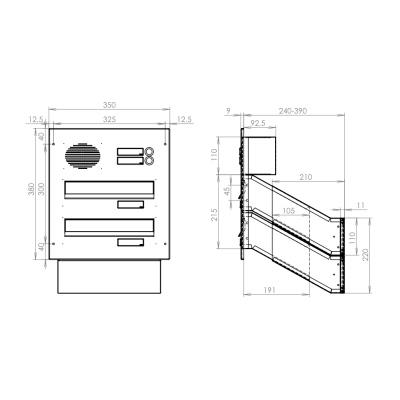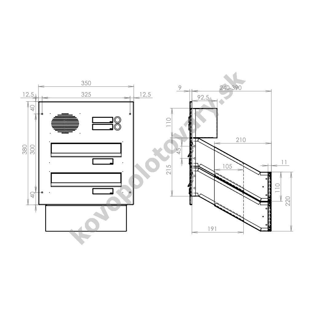 Barva schránky: Nerez; Hloubka schránky: 240 - 390; Jmenovka: Ano; Kamera: Ne; Komunikátor: Ne; Materiál: ocel; ocel nerezová; Montáž: zabudování; Povrchová úprava: barveno; mat / brus K240; pozinkováno; Rozměr čelní desky: 350 x 160; Šířka schránky: 300; Venkovní použití: Ano; Vhoz zásilek: vpředu; Výběr zásilek: vzadu; Výrobce: DOLS; Výška schránky: 110; Zvonkové tlačítko: Ne;