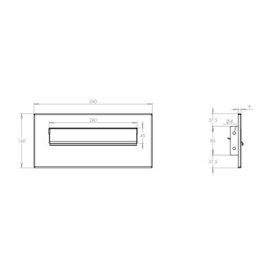 Hloubka schránky: 330 - 500; Jmenovka: Ne; Kamera: Ne; Komunikátor: Ne; Materiál: ocel; Montáž: zabudování; Povrchová úprava: barveno; pozinkováno; Rozměr čelní desky: 350 x 160; Šířka schránky: 300; Venkovní použití: Ano; Vhoz zásilek: vpředu; Výběr zásilek: vzadu; Výrobce: DOLS; Výška schránky: 110; Zvonkové tlačítko: Ne; Barva schránky: Antracit RAL 7016; Černá RAL 9005;