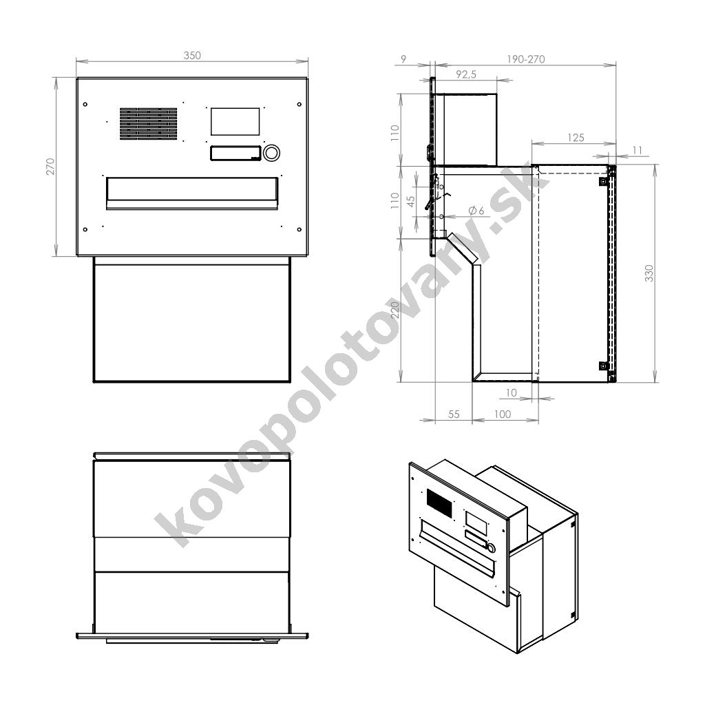 Barva schránky: Nerez; Hloubka schránky: 190 - 270; Jmenovka: Ne; Kamera: Ne; Komunikátor: Ne; Materiál: ocel; ocel nerezová; Montáž: zabudování; Povrchová úprava: barveno; mat / brus K240; pozinkováno; Rozměr čelní desky: 350 x 160; Šířka schránky: 300; Venkovní použití: Ano; Vhoz zásilek: vpředu; Výběr zásilek: vzadu; Výrobce: DOLS; Výška schránky: 330; Zvonkové tlačítko: Ne;