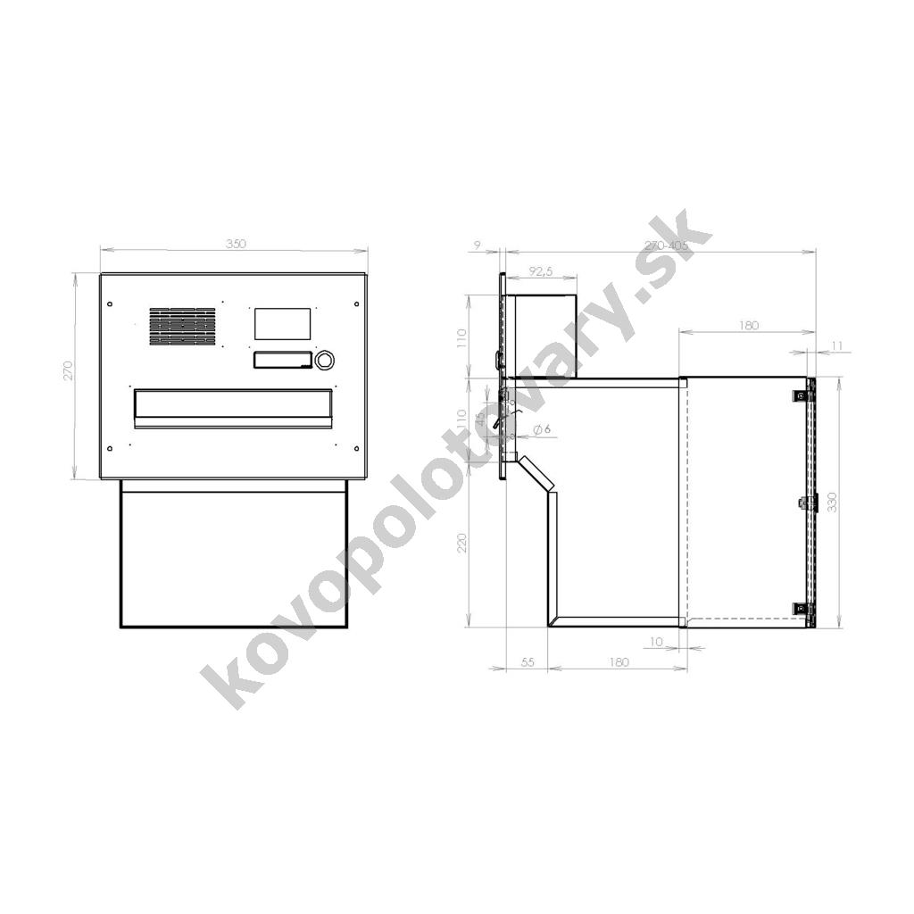 Barva schránky: Nerez; Hloubka schránky: 270 - 405; Jmenovka: Ano; Kamera: Ne; Komunikátor: Ano; Materiál: ocel; ocel nerezová; Montáž: zabudování; Povrchová úprava: barveno; mat / brus K240; pozinkováno; Rozměr čelní desky: 350 x 270; Šířka schránky: 300; Venkovní použití: Ano; Vhoz zásilek: vpředu; Výběr zásilek: vzadu; Výrobce: DOLS; Výška schránky: 440; Zvonkové tlačítko: Ano;