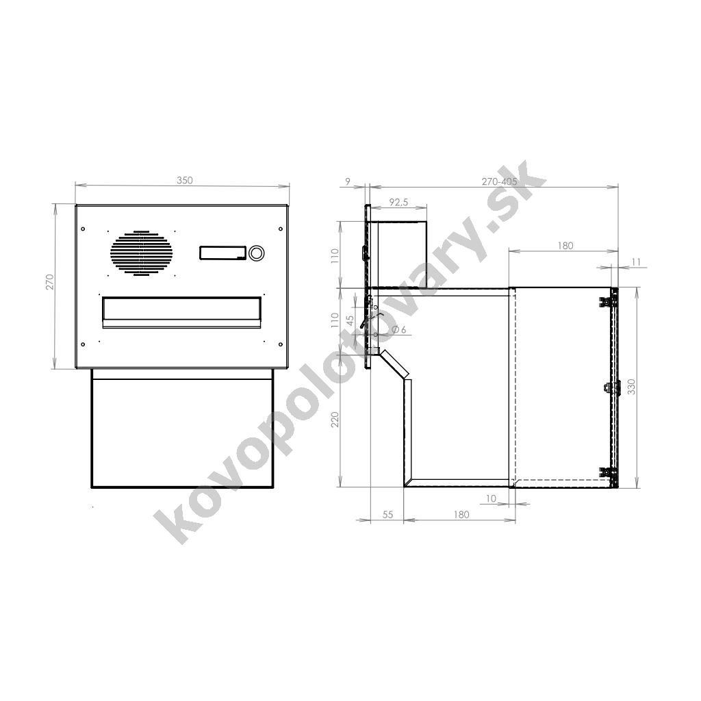 Barva schránky: Nerez; Hloubka schránky: 270 - 405; Jmenovka: Ne; Kamera: Ne; Komunikátor: Ne; Materiál: ocel; ocel nerezová; Montáž: zabudování; Povrchová úprava: barveno; mat / brus K240; pozinkováno; Rozměr čelní desky: 350 x 160; Šířka schránky: 300; Venkovní použití: Ano; Vhoz zásilek: vpředu; Výběr zásilek: vzadu; Výrobce: DOLS; Výška schránky: 330; Zvonkové tlačítko: Ne;