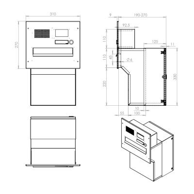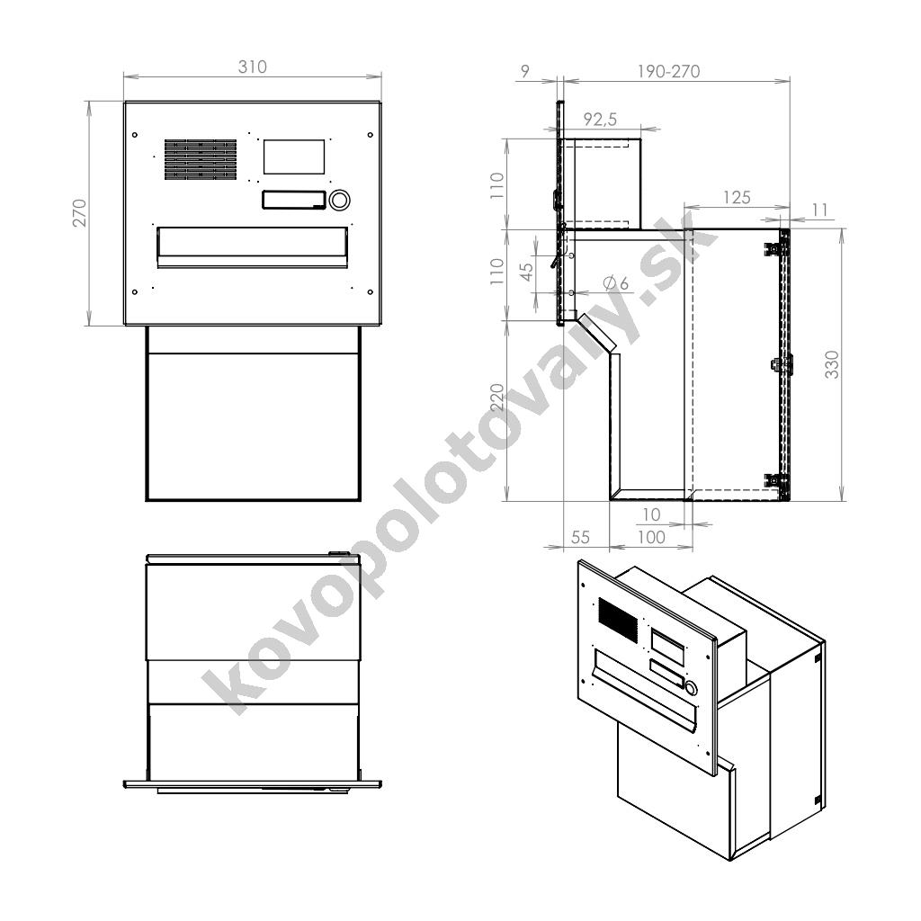 Barva schránky: Nerez; Hloubka schránky: 190 - 270; Jmenovka: Ano; Kamera: Ne; Komunikátor: Ne; Materiál: ocel; ocel nerezová; Montáž: zabudování; Povrchová úprava: barveno; mat / brus K240; pozinkováno; Rozměr čelní desky: 310 x 160; Šířka schránky: 260; Venkovní použití: Ano; Vhoz zásilek: vpředu; Výběr zásilek: vzadu; Výrobce: DOLS; Výška schránky: 330; Zvonkové tlačítko: Ano;