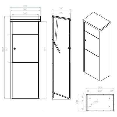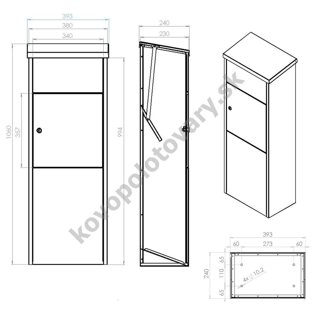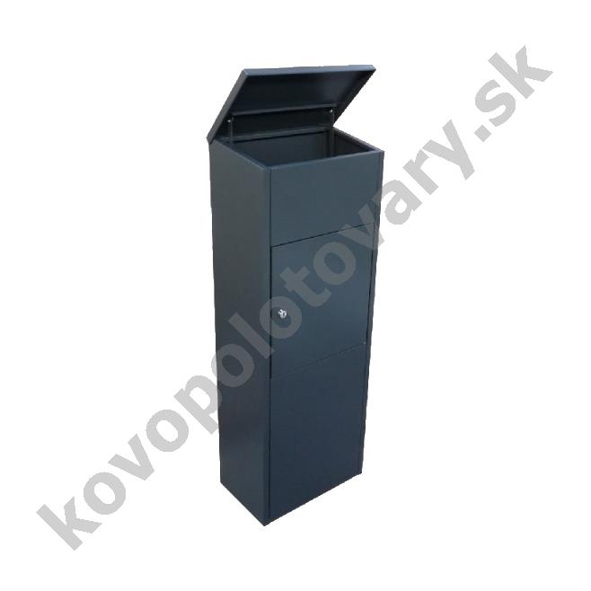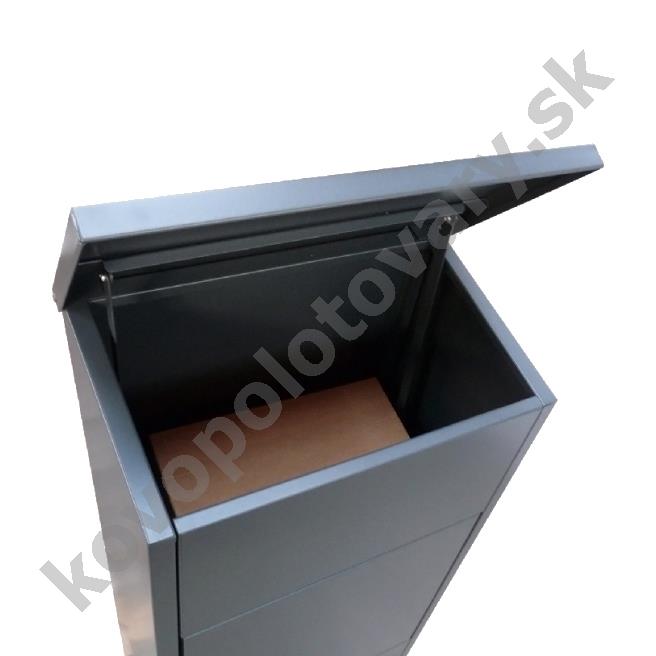 Lakovaná poštová schránka na balíky. Pod strieškou sa nachádza sklápací mechanizmus, ktorý pri sklopení striešky presunie zásielku do spodného uzamykateľného priestoru.