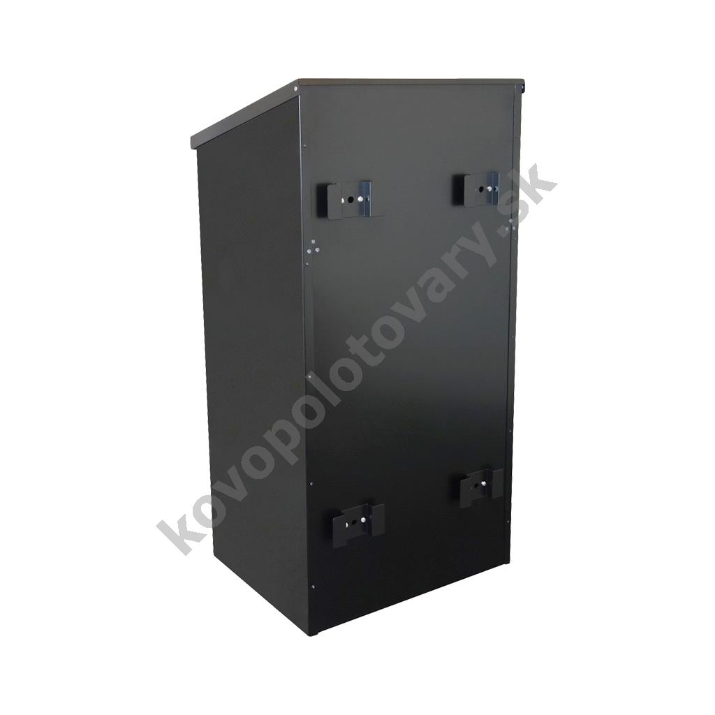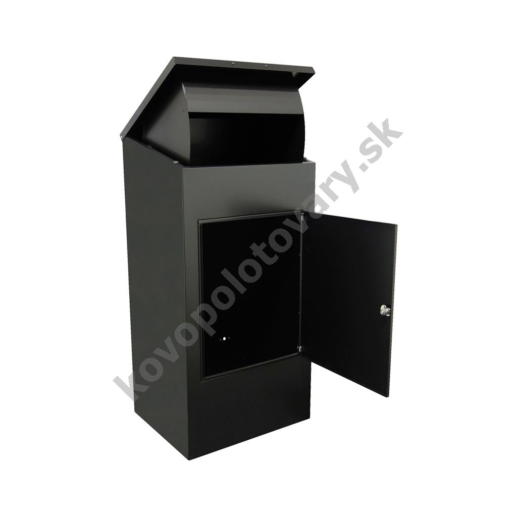 Lakovaná poštová schránka na balíky. Pod strieškou sa nachádza sklápací mechanizmus, ktorý pri sklopení striešky presunie zásielku do spodného uzamykateľného priestoru.