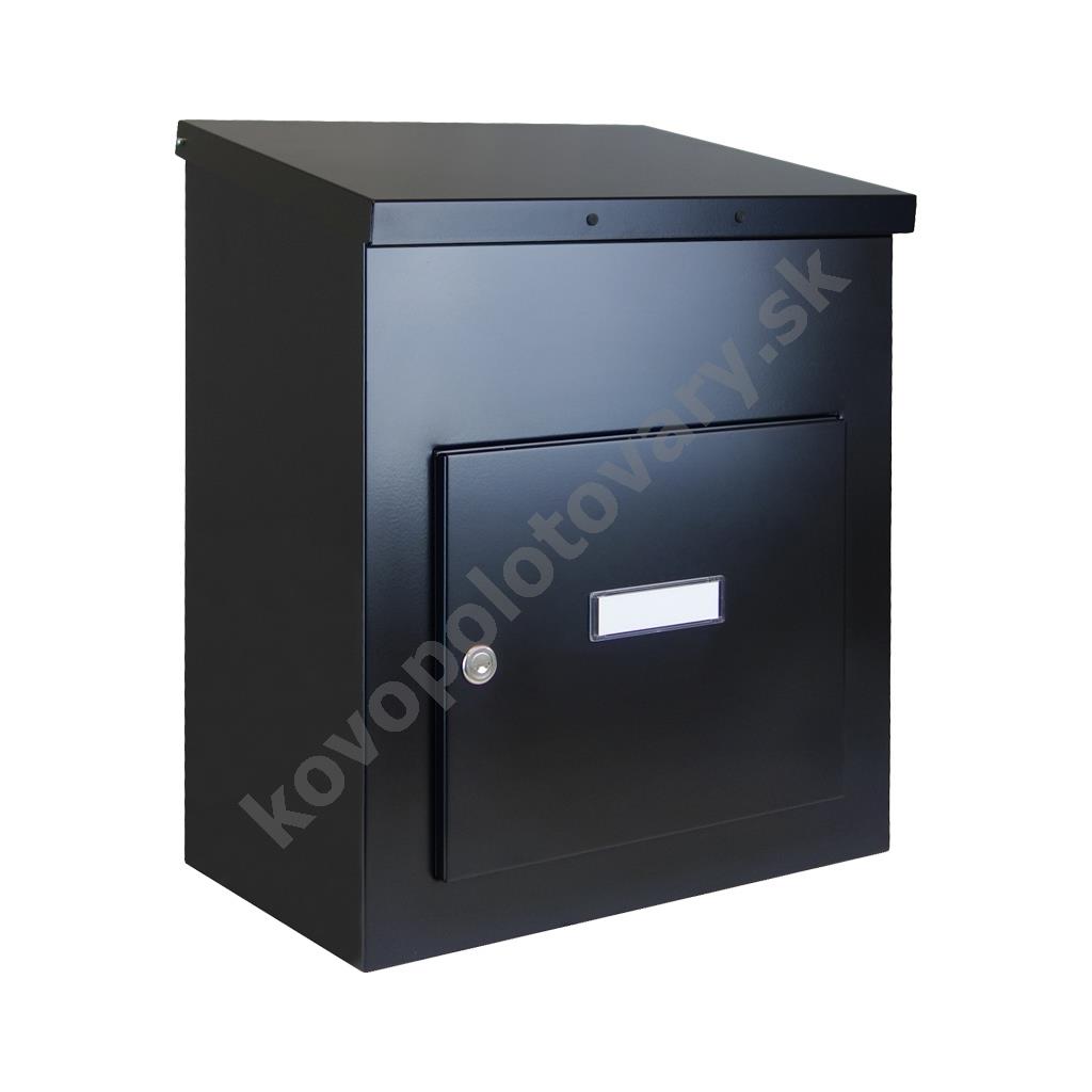 Lakovaná poštová schránka na balíky. Pod strieškou sa nachádza sklápací mechanizmus, ktorý pri sklopení striešky presunie zásielku do spodného uzamykateľného priestoru.
