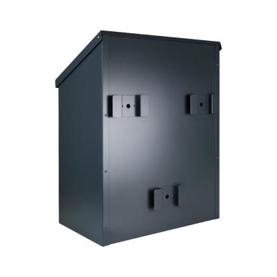 Lakovaná poštová schránka na balíky. Pod strieškou sa nachádza sklápací mechanizmus, ktorý pri sklopení striešky presunie zásielku do spodného uzamykateľného priestoru.