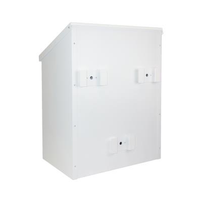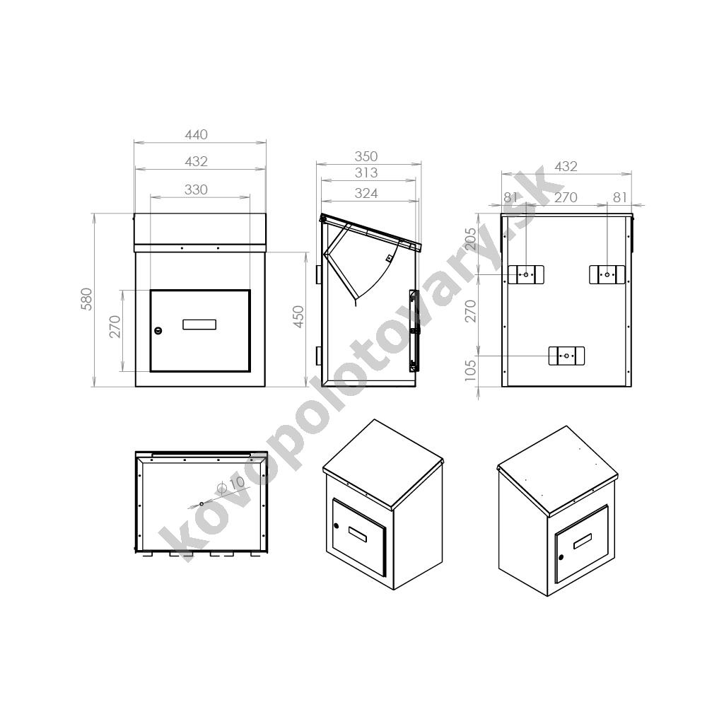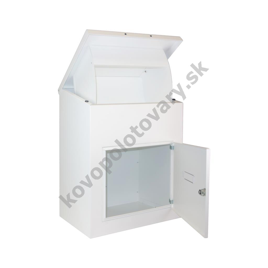 Lakovaná poštová schránka na balíky. Pod strieškou sa nachádza sklápací mechanizmus, ktorý pri sklopení striešky presunie zásielku do spodného uzamykateľného priestoru.