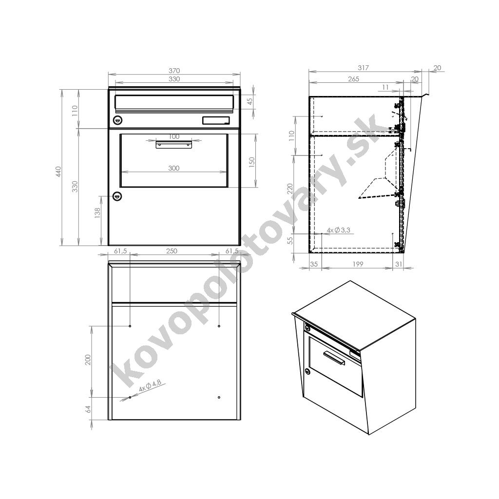 Lakovaná kombinovaná poštová schránka na balíky i listy, s opláštením. V predných dvierkach je zabudovaný vyklápací mechanizmus, ktorý pri zaklopení presunie zásielku do uzamykateľného priestoru.