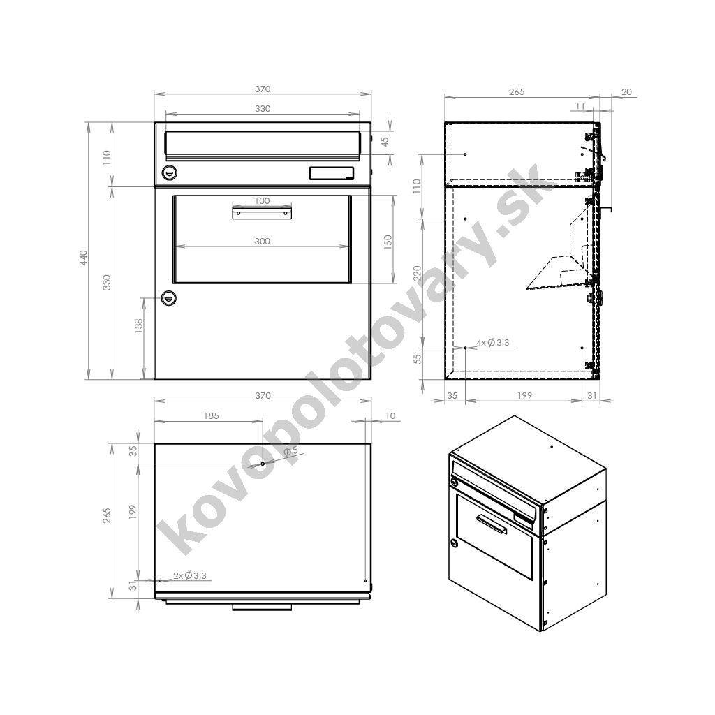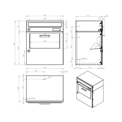 Barva schránky: Antracit RAL 7016; Délka balíku: 101; Hloubka schránky: 265; Jmenovka: Ne; Kamera: Ne; Komunikátor: Ne; Materiál: ocel; Montáž: na stěnu; zabudování; Povrchová úprava: barveno; pozinkováno; Šířka schránky: 330; Venkovní použití: Ano; Vhoz zásilek: vpředu; Výběr zásilek: vpředu; Výrobce: DOLS; Výška schránky: 370; Zvonkové tlačítko: Ne;
