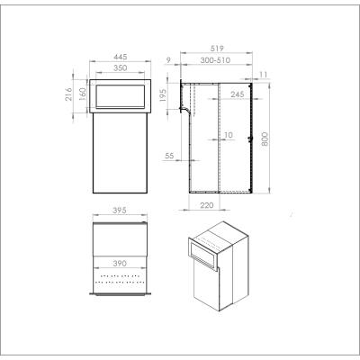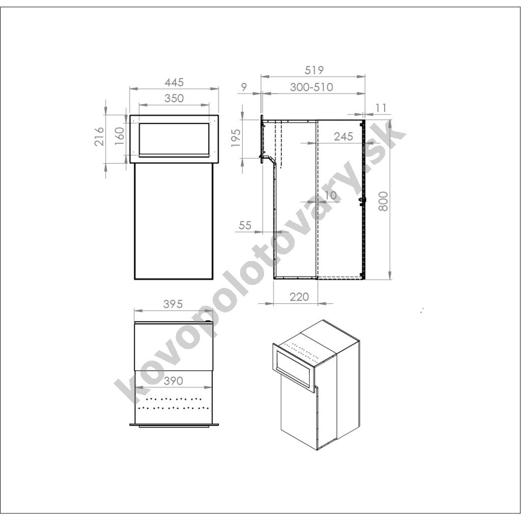 Barva schránky: Černá RAL 9005; Délka balíku: 101; Hloubka schránky: 300 - 510; Jmenovka: Ne; Kamera: Ne; Komunikátor: Ne; Materiál: ocel; Montáž: zabudování; Povrchová úprava: barveno; pozinkováno; Šířka schránky: 395; Venkovní použití: Ano; Vhoz zásilek: vpředu; Výběr zásilek: vzadu; Výrobce: DOLS; Výška schránky: 800; Zvonkové tlačítko: Ne;