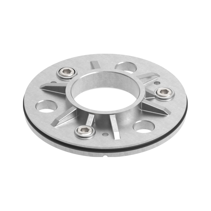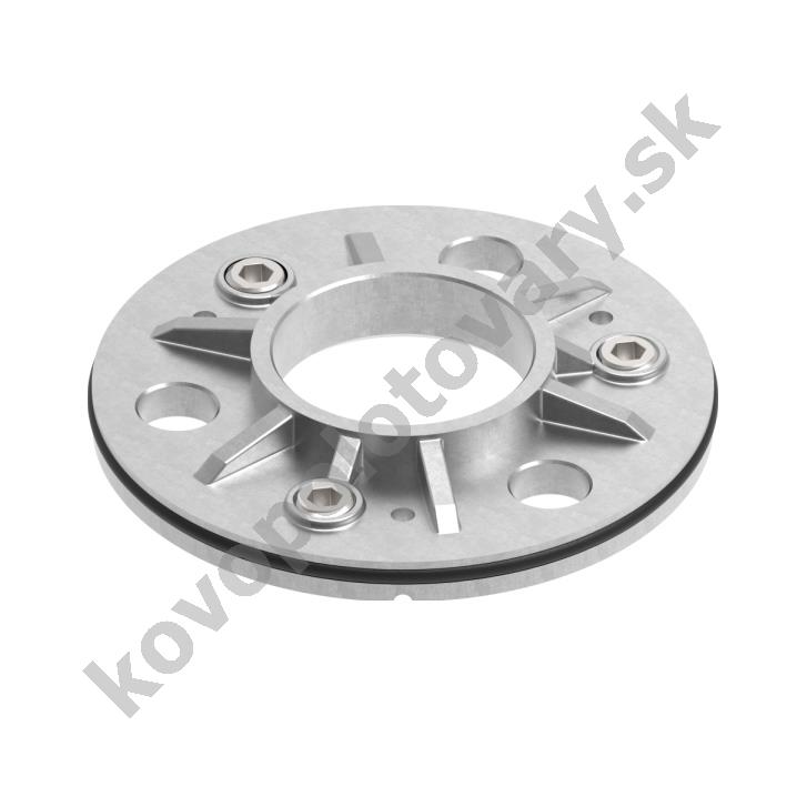 Nerezová kotviaca príruba s gumovým tesnením pre kryciu rozetu určená na použitie ako základňa stĺpika zábradlia. Určené pre vnútorné i vonkajšie použitie v systémoch stavebnicového nerezového zábradlia a schodísk.