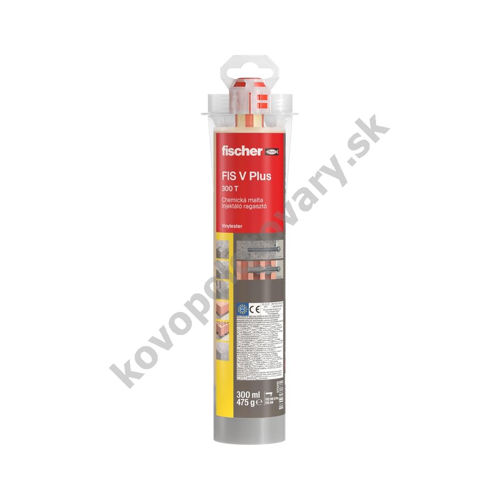 Fischer V PLUS 300 T (575210) Univerzálna chemická injektážna malta, dodávaná vrátane dvoch miešacích trysiek. Hybridný kotviaci systém na báze vinylesterovej živice bez obsahu styrénu. Táto chemická kotva je certifikovaná na použitie v betóne aj murive, vrátane ťahanej a tlačenej zóny.