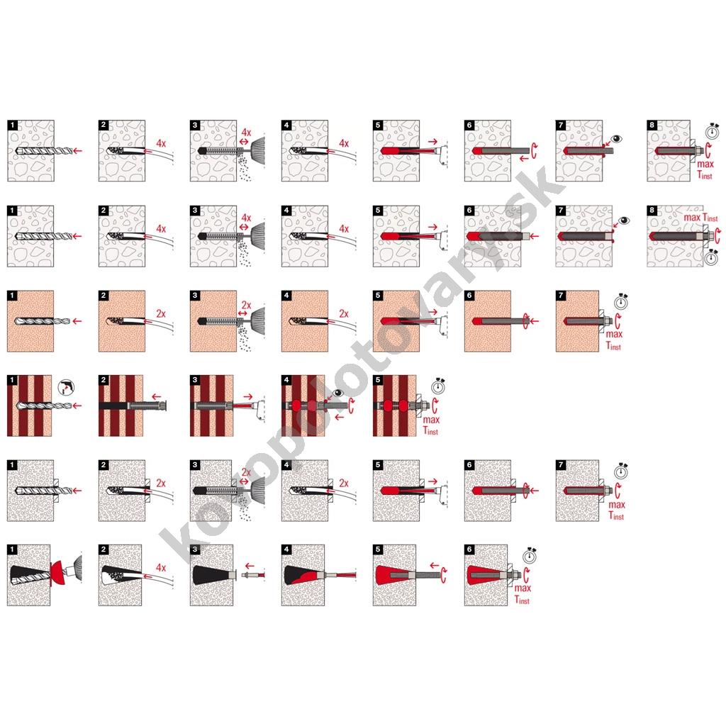 Pri kotvení v plných materiáloch je nutné vyvŕtané diery dôkladne vyčistiť. Chemickú kotvu je možné pohodlne aplikovať pomocou aplikačnej pištole (aplikačná pištoľ nie je súčasťou balenia).