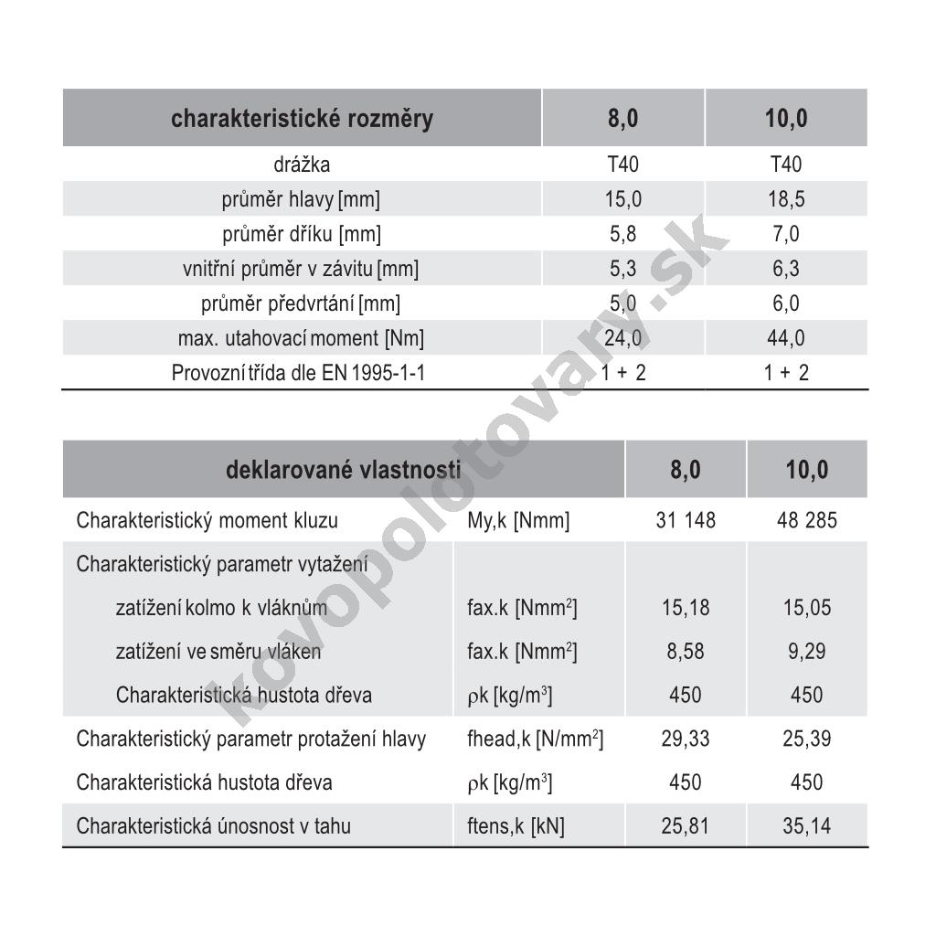 Délka: 260; Drážka: T40; Materiál: ocel; Povrchová úprava: galvanické pozinkování; lak; Průměr hlavy: 15; Průměr závitu: 8; Typ hlavy: zápustná; Výrobce: HPM TEC;