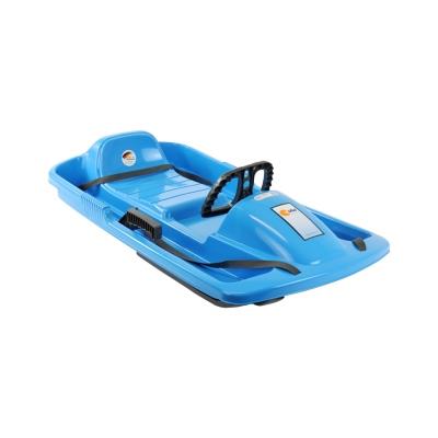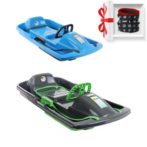 Sada dvoch riadených detských plastových bôbov na sneh, s volantom a kovovou ručnou brzdou, od nemeckého výrobcu KHW GmbH. Boby sú vyrobené z veľmi kvalitného vysokohustotného polyetylénu.