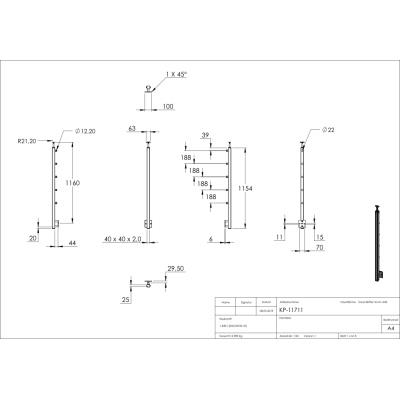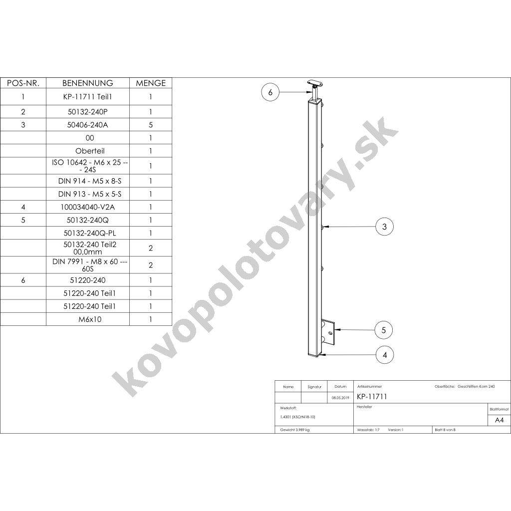 KP-11711 Stĺpik nerezového zábradlia pre prútovou výplň, skompletizovaný v hotový výrobok pripravený na montáž. Je určený pre zábradlie s maximálnym prepadom do 12 m (podľa platných noriem ČSN).