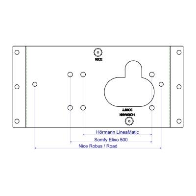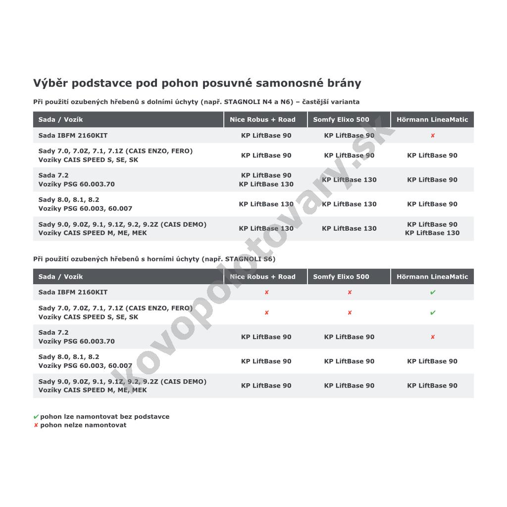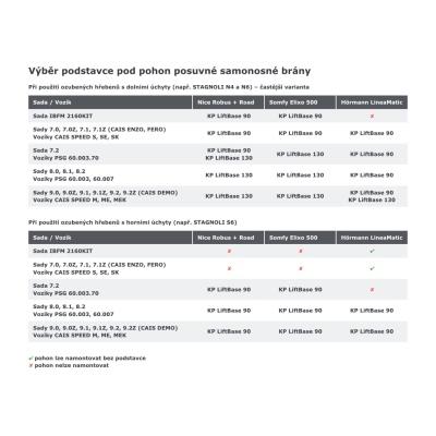 Tento podstavec má predvŕtané otvory pre pohony sérií Nice Robus a Road, Somfy Elixo 500 a Hörmann LineaMatic. Jednotlivé typy pohonov majú pastorok v rôznych výškach a rovnako tak jednotlivé typy nosných vozíkov majú rôzne výšky a ešte záleží, či použijete ozubené vodiace hrebene s hornými alebo spodnými úchytmi. V tabuľkách nižšie preto uvádzame, v akých kombináciách možno tento podstavec použiť.