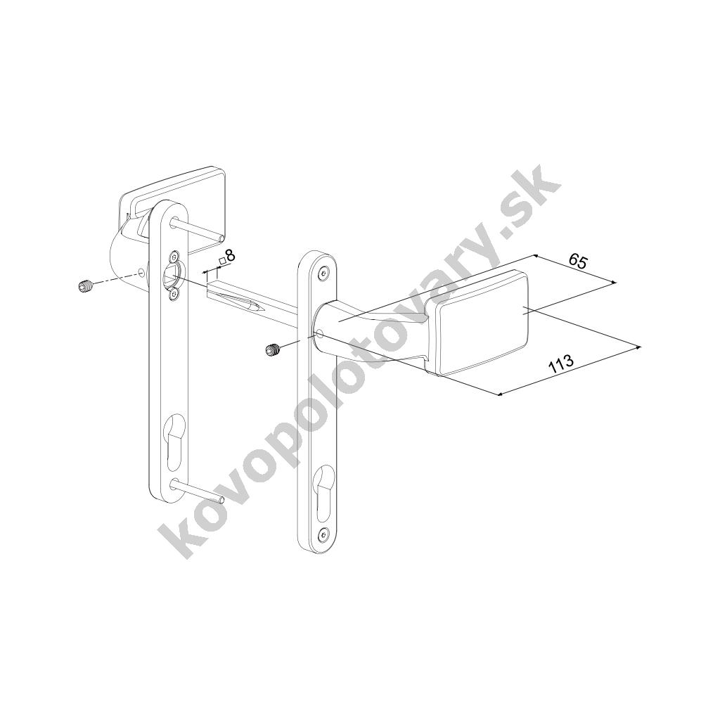 Hliníková kľučka so štítkom pre dvere a krídlové bránky. Obe strany možné nezávisle na sebe zafixovať, teda určiť, či bude daná strana pevná alebo otočná.