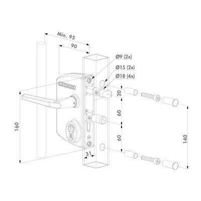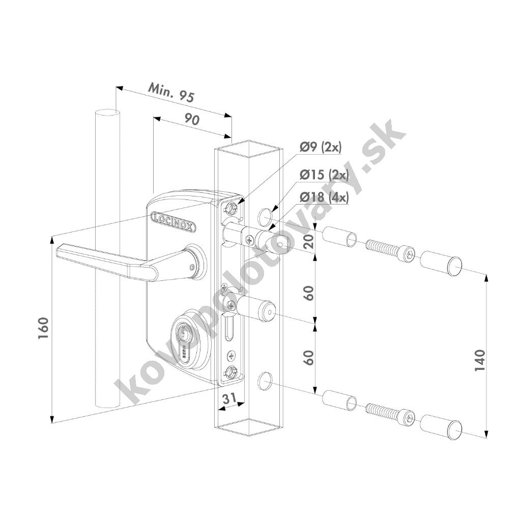 Komplet zámkovej krabice, zámku, kľučky a cylindrickej vložky pre krídlové bránky s šírkou jeklu 60 až 80 mm. Možno použiť pre ľavé aj pravé otváranie.
