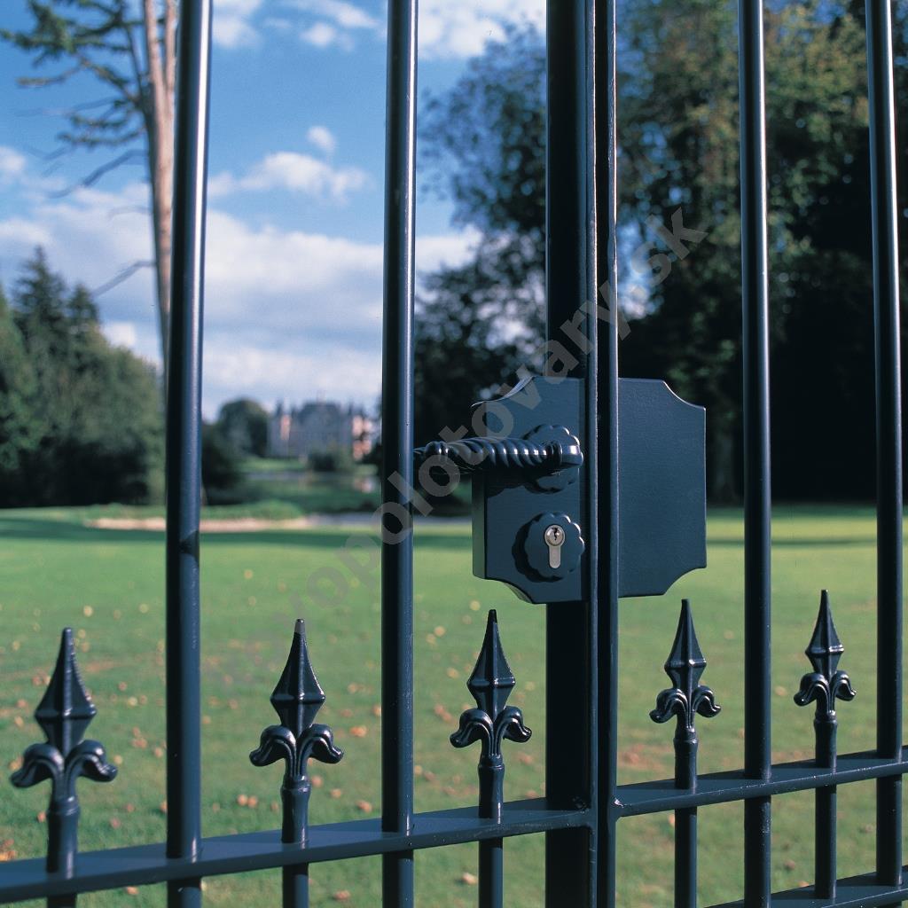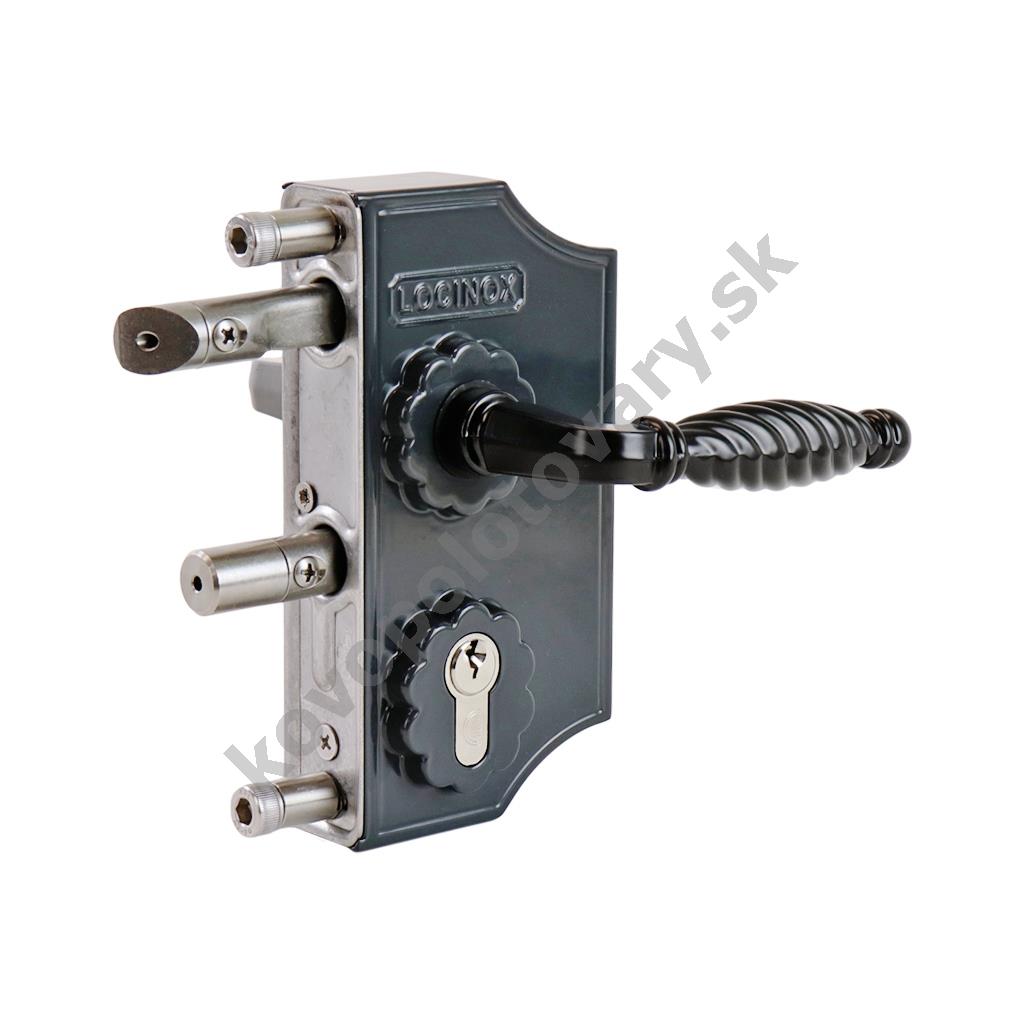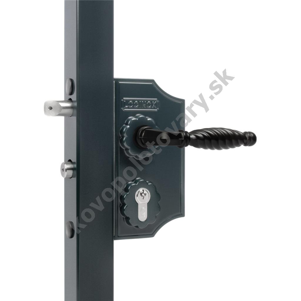 Komplet zámkovej krabice, zámku, zdobenej kľučky a cylindrickej vložky pre krídlové bránky s šírkou jeklu 40 až 50 mm. Možno použiť pre ľavé aj pravé otváranie.