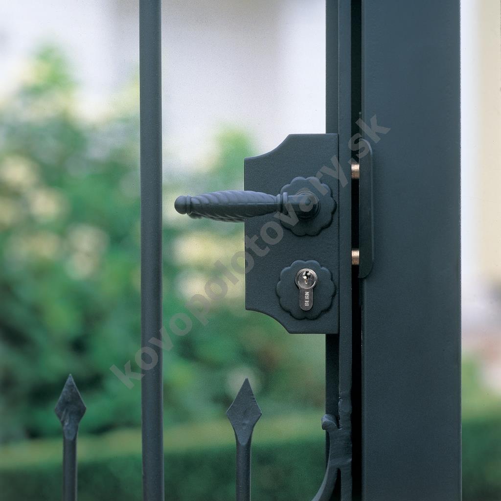 Komplet zámkovej krabice, zámku, zdobenej kľučky a cylindrickej vložky pre krídlové bránky s šírkou jeklu 40 až 50 mm. Možno použiť pre ľavé aj pravé otváranie.