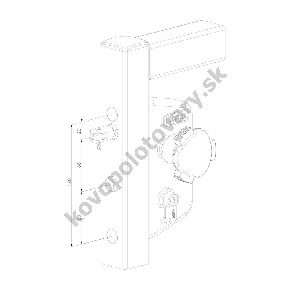 Komplet zámkovej krabice, zámku, kľučky (gule) s detskou poistkou a cylindrickej vložky pre krídlové bránky s šírkou jeklu 50 mm. Možno použiť pre ľavé aj pravé otváranie.