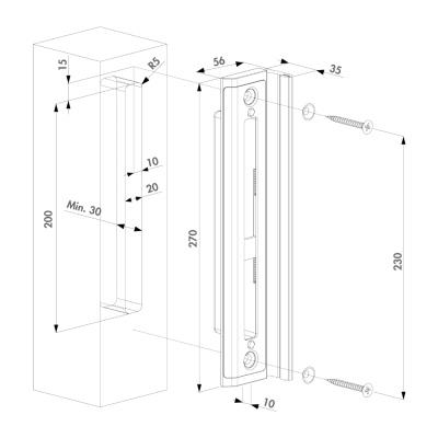 LOCINOX SHKW ALUM - dorazová lišta pro zadlabací zámek H-WOOD, pro profil 40 až 60 mm, pro dřevěné křídlové branky, stříbrná