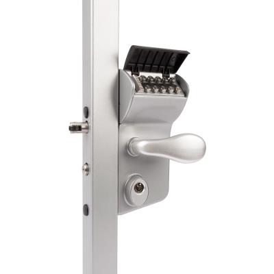 Komplet zámkovej krabice s mechanicky kódovaným zámkom, kľuky (1 pár) a cylindrické vložky, pre krídlové bránky s šírkou jeklu 40 až 60 mm. Možno použiť pre ľavé aj pravé otváranie.