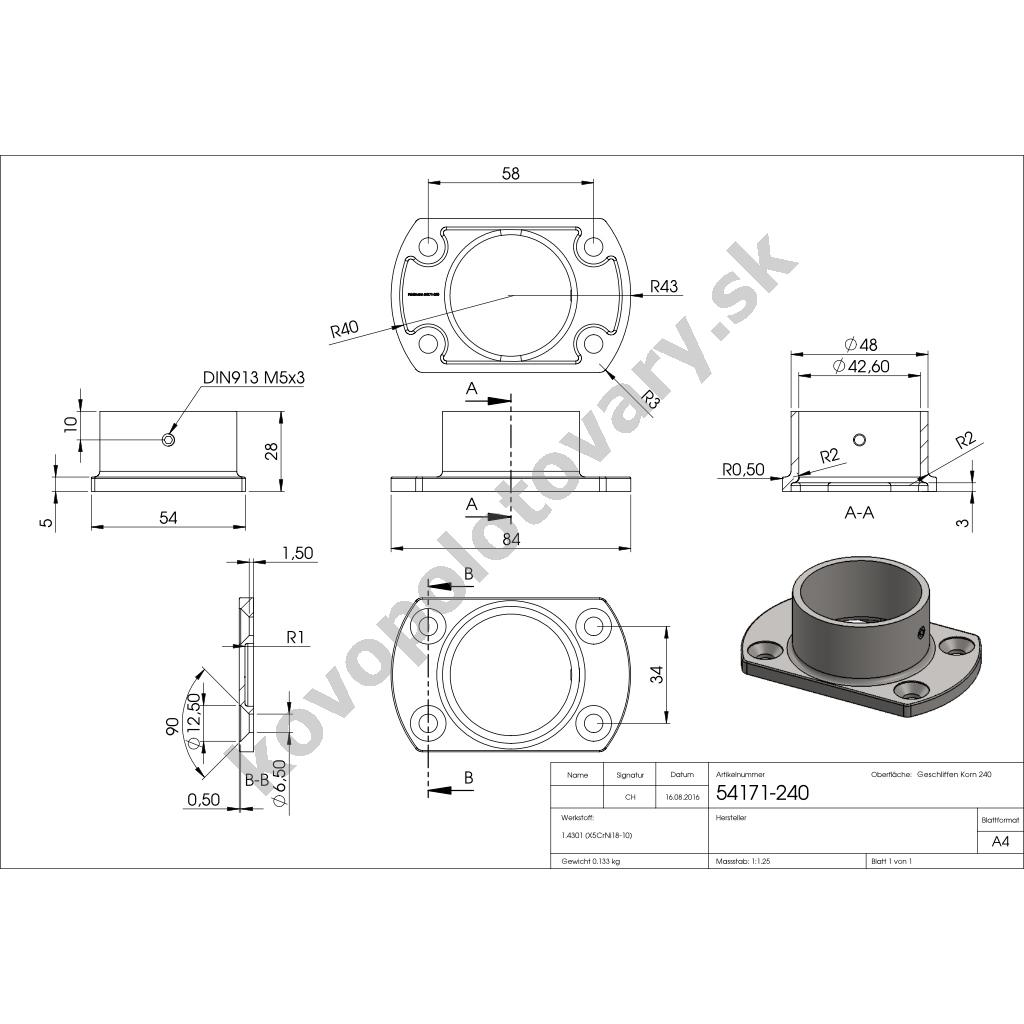 Nerezová kotviaca príruba zábradlia pre pr.42,4 mm 54171-240, vrchné i bočné kotvenie