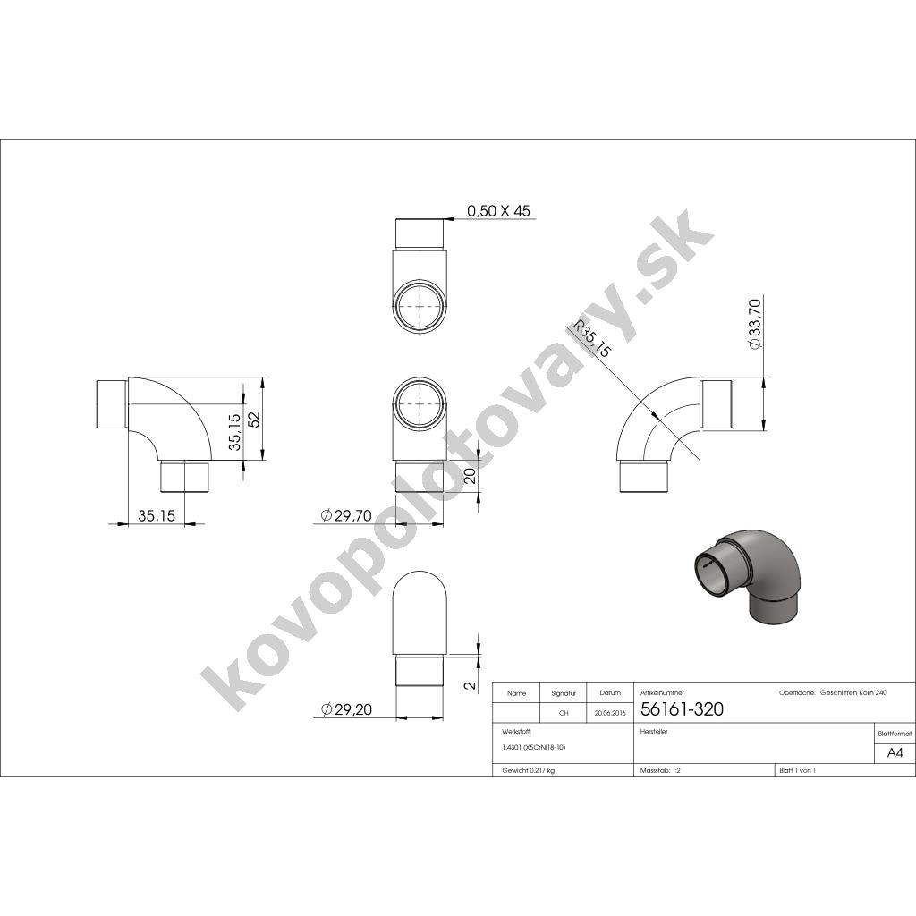 Nerezová spojka madla zábradlia pr.33,7 mm 56166-320 zaoblená 90°, AISI 304 brus