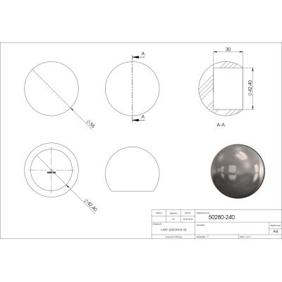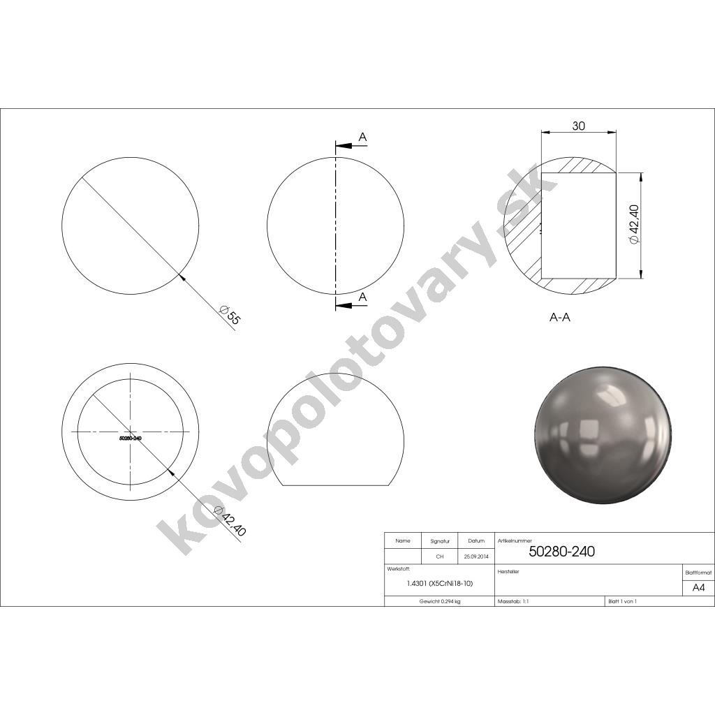 Nerezové ukončení madla zábradlí pr.42,4 mm 50280-240 plné a vypouklé, AISI 304 brus